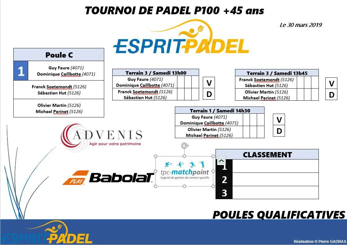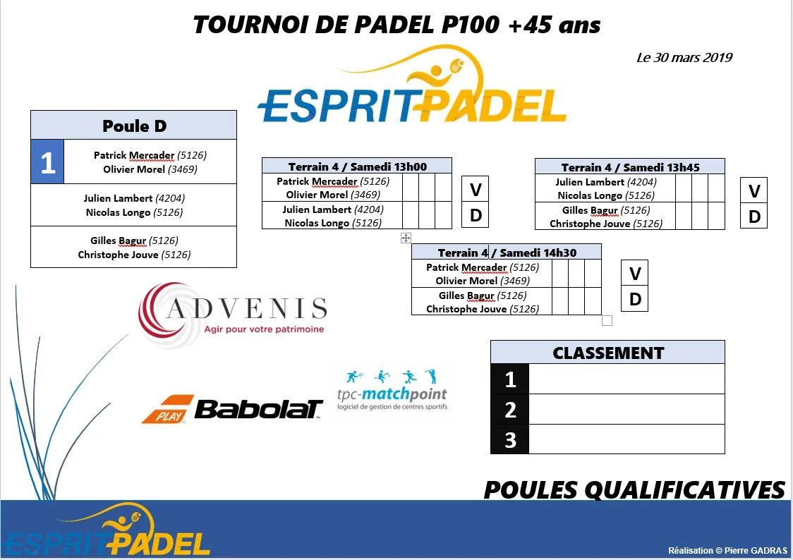 Le premier tournoi +45 ans lyonnais est prêt. Il aura lieu à Esprit Padel le 30 mars prochain. Il s’agira d’un tournoi dames et messieurs. Finale prévue à 18h. Puis, un apéro hispanique viendra conclure cette belle journée de Padel.
