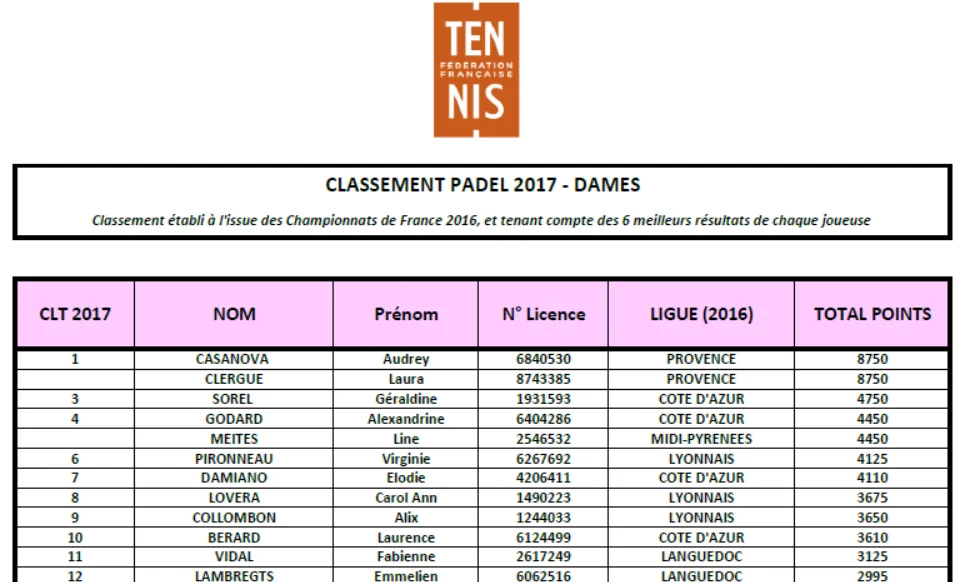 Chez les dames, le nouveau classement de padel dames dénombre 211 compétitrices. classement-padel-2017-dames