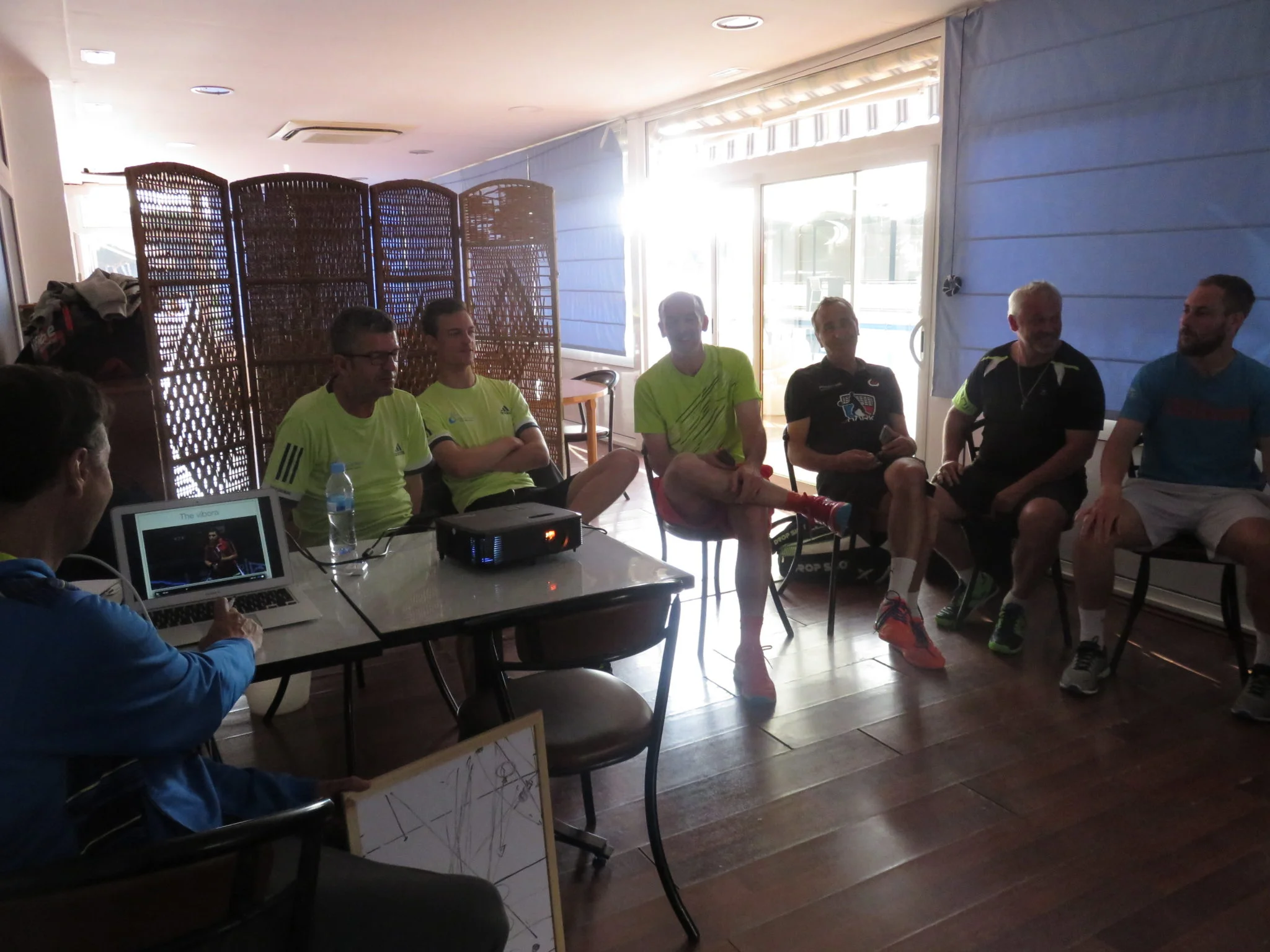 Oriol nous attend de pied ferme dans la salle vidéo pour ce qui sera la dernière séance avec lui. Aujourd’hui on approfondit la tactique sur le jeu au centre du terrain puis on enchaîne sur les différents types de smash. Bandeja, vibora, par 3 et par 4 n’ont désormais plus de secret pour nous. Si vous n’êtes pas familier avec ces termes n’hésitez pas à vous rendre sur la partie technique du site où vous allez trouver de nombreuses vidéos explicatives.
