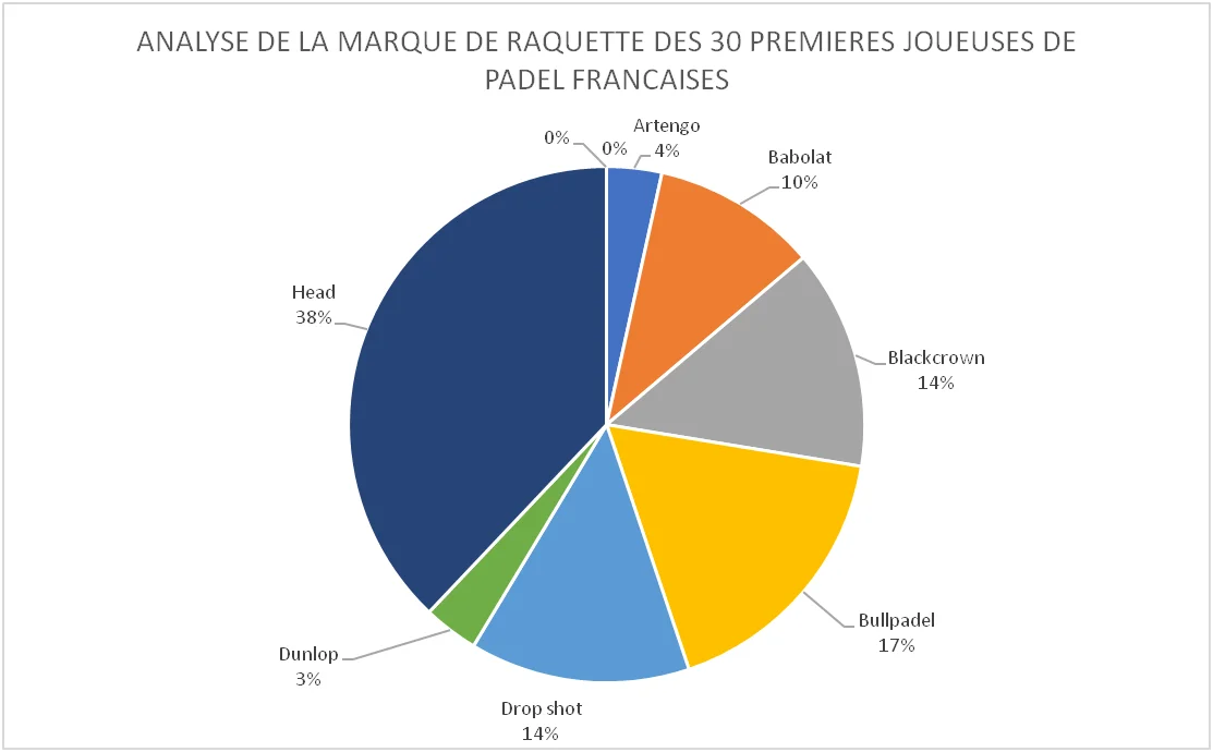 Il n’y a pas encore de données sur les ventes de raquettes de Padel en France. J’ai analysé les raquettes des 100 premiers joueurs français (je n’ai réussi à trouver que 86 joueurs sur 100) et j’ai fait le graphique ci-dessous. Parmi le top 100, Head domine largement le marché. Je pense que ce graphique reflète assez bien ce qu’il se passe sur le marché français. Quand vous regardez les tournois de Padel, les photos sur Facebook des tournois, vous pouvez voir la domination de Head.