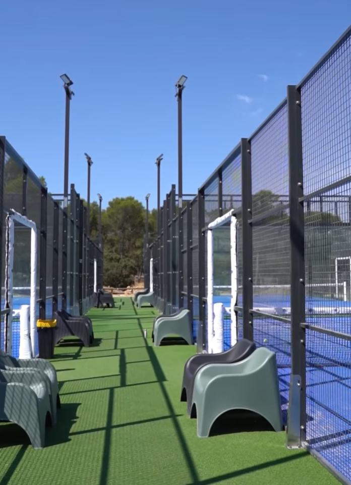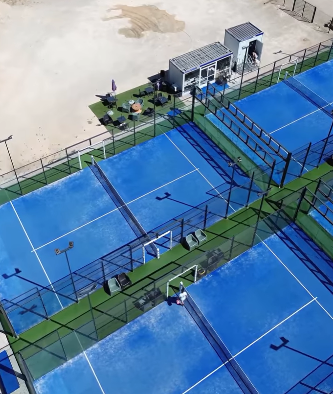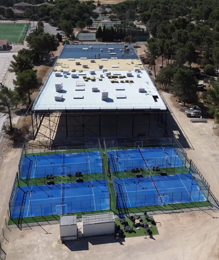 15 pistes prévues : 4 outdoor (juin 2025) et 11 indoor (fin 2025) dont 2 terrains centraux panoramiques face au club house, idéals pour les grands événements.