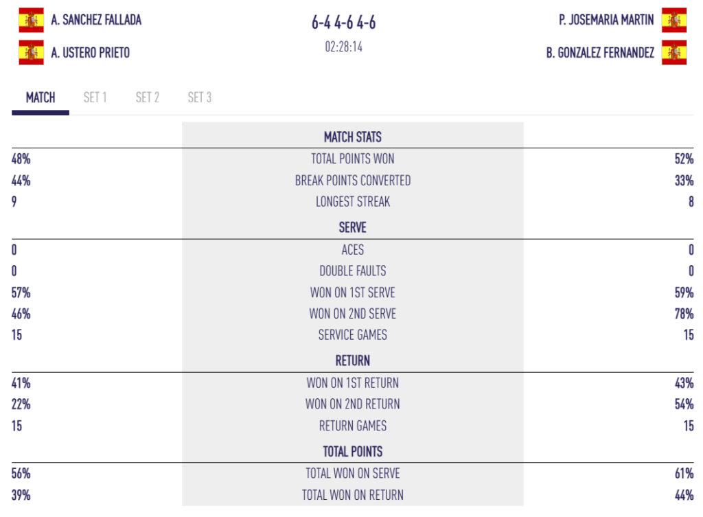 C’était en effet la deuxième confrontation entre les deux paires cette saison, après leur premier duel au Gijon P2, remporté par Sánchez / Ustero : 6/2 3/6 6/4.