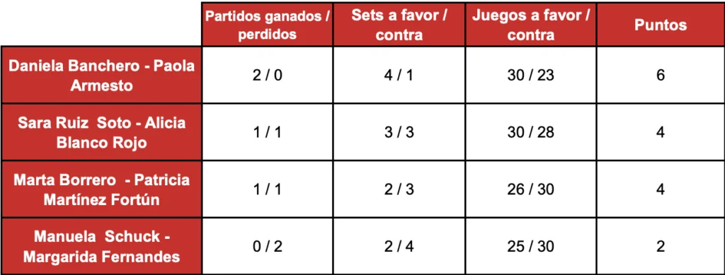 Au terme de deux rencontres très spectaculaires qui auront duré plus de deux heures chacune, Banchero/Armesto pointe à la tête du groupe féminin.
