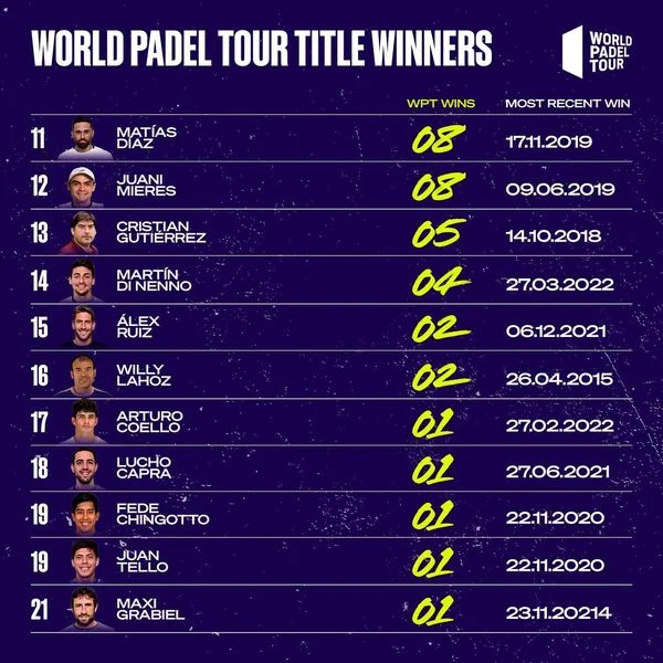 Bela est évidemment en tête avec 63 titres, suivi de son ancien coéquipier, le Brésilien Pablo Lima avec 50. Ale Galan est encore loin de Bela avec 24 titres. Juan Lebron est quant à lui à 41 titres de l’Argentin !