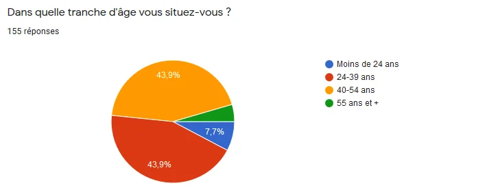 Concernant l’âge : parmi les personnes qui ont répondu, 43,9% appartiennent à la tranche d’âge 24-39 ans, et 43,9% à la tranche 40-54 ans.