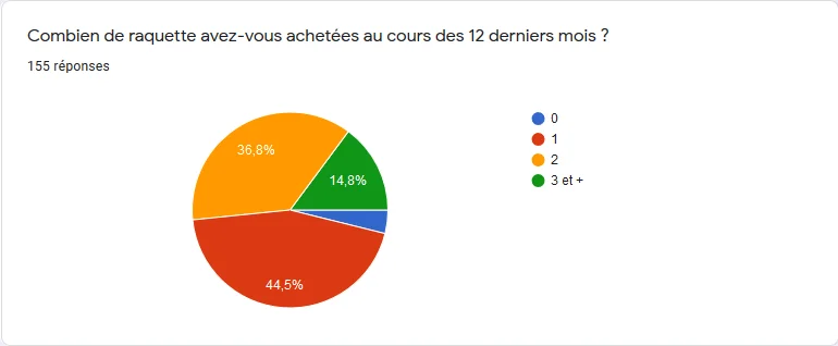 Premièrement, on remarque que parmi les interrogés, seuls 3,9% n’ont pas acheté de raquette au cours des 12 derniers mois. On peut donc penser que les joueurs de padel changent de raquette, au moins tous les ans. 44,5% en ont acheté une sur cette période, 36,8% en ont acheté 2, et 14,8% ont acheté au moins 3 raquettes sur la dernière année.