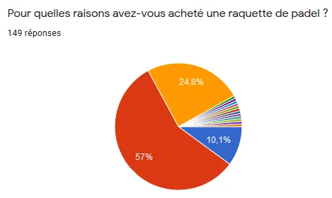 Et justement, concernant, la cause de cet achat, on retrouve trois grands groupes : 57% ont acheté une raquette car la leur était cassée ou usée, 24,8% pour le plaisir, et 10,1% car c’était leur première raquette. On voit donc premièrement que les palas ont une durée de vie limitée, mais aussi que pour 1/4 des participants à l’étude, l’achat d’une raquette constitue un achat plaisir. Ensuite, dans les petits groupes, on retrouve en premier lieu la montée en gamme, suite à une évolution du niveau de jeu, avec plus de 5%.