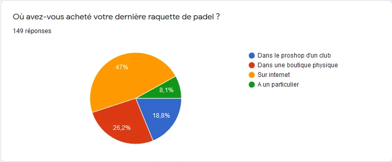 Internet est le moyen privilégié par les joueurs pour effectuer leur achat de raquette : 47% y ayant eu recours. Viennent ensuite les boutiques physiques (26,2%), puis les proshops des clubs (18,8%). Enfin, les achats à un particulier représentent 8,1%, ce qui montre que le marché de l’occasion existe bien concernant les raquettes de padel mais il reste très minoritaire.