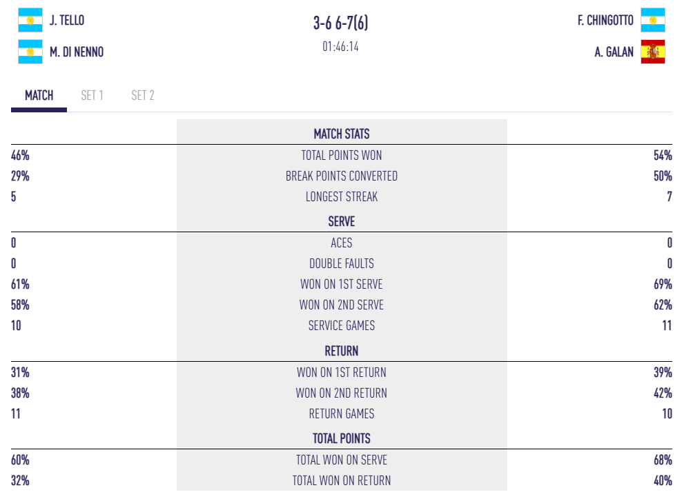 Place donc au tie-break pour conclure ce bras de fer. Tello et Di Nenno prennent l’avantage, jusqu’à mener 5-3. Et là, tout bascule : point litigieux, Di nenno proteste, Galán s’agace, les esprits s’échauffent. Le point est finalement accordé à Galán, et l’atmosphère se tend brutalement. Dans cette fin de match nerveuse, ce sont Galán et Chingotto qui gardent la tête froide et plient le match sur un tie-break étouffant.