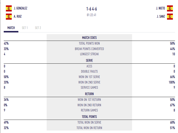 Chez les messieurs, la paire Nieto / Sanz n’avait pas eu trop de difficulté pour battre la paire Gonzalez / Ruiz en deux sets : 6/1, 6/4, en moins de 1h30 de match.