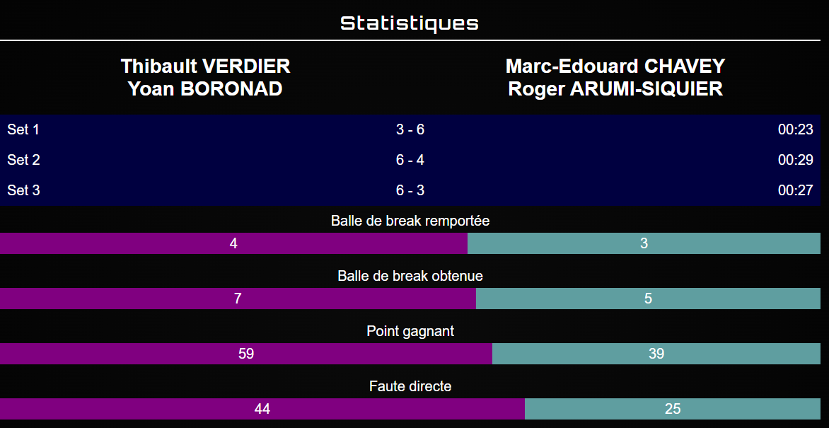 Comme en demi-finale, Boronad et Verdier ont eu besoin d’un set pour entrer pleinement dans leur match. La paire Chavey / Arumi, plus agressive d’entrée, fait le break dès le premier jeu et s’installe rapidement dans le match. Thibault Verdier, en difficulté, concède plusieurs points clés tandis que Roger Arumi impose son rythme. Malgré un regain chez la tête de série 1 en fin de manche, le break initial suffit : 6/3 pour la TS2.