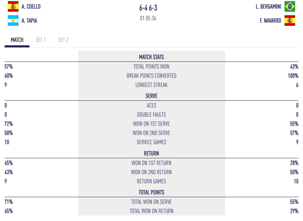 Malgré le très bon niveau affiché par Navarro et Bergamini, Coello et Tapia n’ont jamais tremblé. En véritable machine bien huilée, le duo hispano-argentin a su faire la différence au moment opportun : un break dans chaque set aura suffi pour construire cette victoire en seulement 1h05 de jeu.
