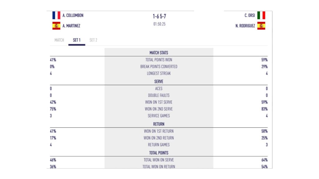 Le premier set est totalement à l’avantage de la paire Orsi / Rodriguez, face à Collombon / Martinez qui peine à rentrer dans son match. Le duo franco-espagnol se ressaisit dans le deuxième set, en prenant d’entrée le service adverse et en menant rapidement 4 jeux à 1. Les deux joueuses se procurent même deux occasions de creuser l’écart à 5-2, mais sans succès. Orsi / Rodriguez recolle à 4-4.