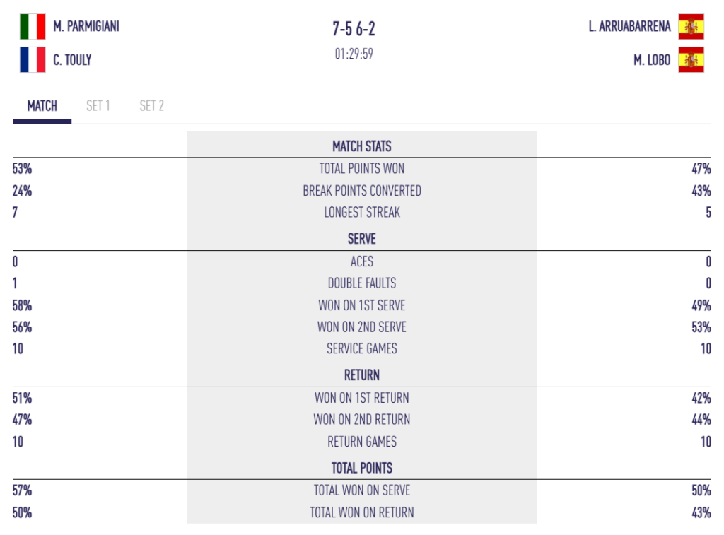 Opposées à Lara Arruabarrena / Marina Lobo, deux joueuses du top 50 mondial, Touly et Parmigiani ont livré un match très solide pour s’imposer 7/5 6/2.
