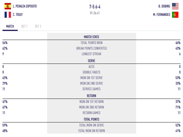 Dans un match accroché, Touly et Peralta ont su faire la différence quand il le fallait. Le premier set, très disputé, s’est finalement joué à 5/5, où la paire franco-espagnole a montré plus de lucidité et de solidité pour prendre l’avantage et un break a suffit dans le second pour remporter ce match.