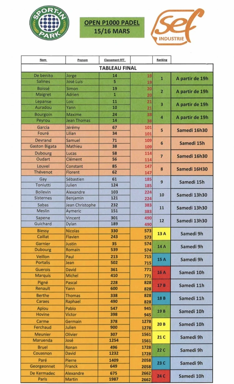 En jeu, une énième victoire pour Adrien Maigret dans un P1000 français. Mais la petite surprise, c’est son partenaire. Benjamin Tison est obligé d’abandonner son poste. C’est le responsable du centre hôte de cette épreuve de padel, Simon Boissé qui se chargera d’occuper le poste de joueur de droite. Tête de série n°2 du tableau et placé dans le haut du tableau, les choses sérieuses débuteront en demi-finale face à la paire Yann Auradou / Loïc Le Panse. Un match qui pourrait bien être très accroché entre ces deux paires.