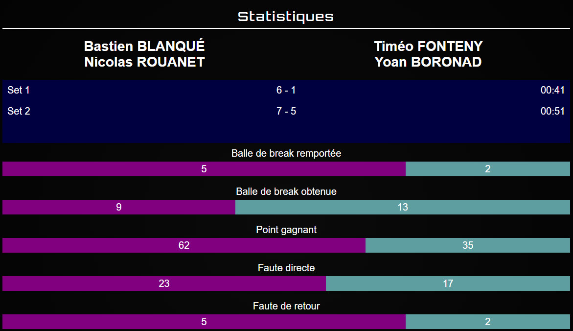 Dans la deuxième manche, Boronad et Fonteny élèvent leur niveau et conservent plus facilement leurs engagements. À 3/3, un moment clé : sur un geste d’agacement de Boronad, la paire concède un point de pénalité et offre deux balles de break à leurs adversaires. Blanqué et Rouanet ne les convertissent pas et se font breaker dans la foulée.