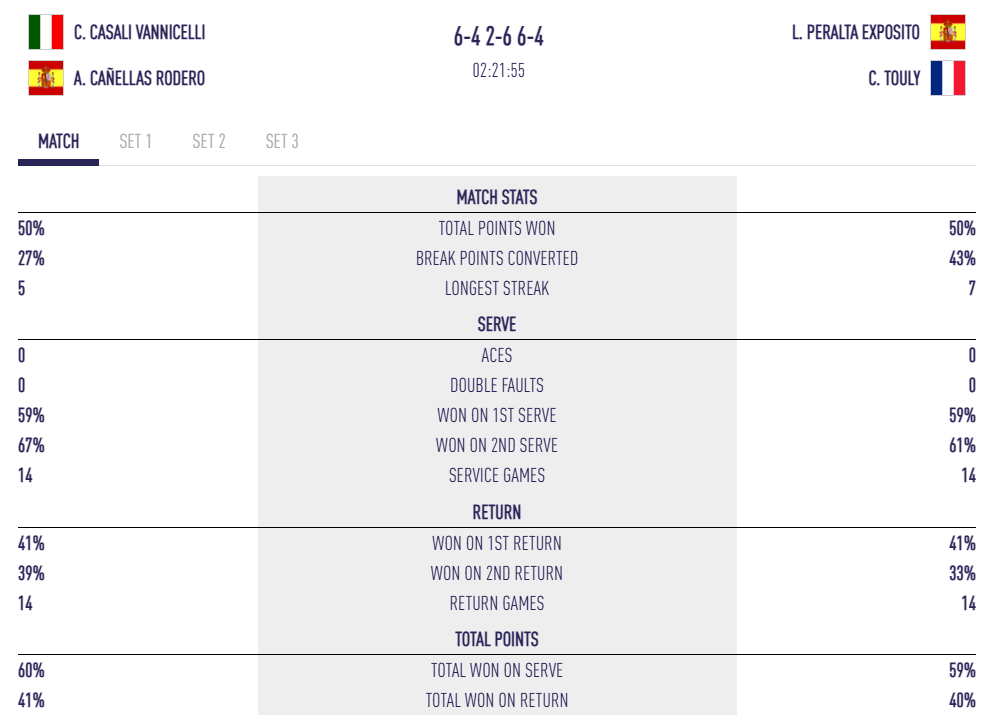 Sur le papier, la rencontre s’annonçait équilibrée, mais Casali et Cañellas disposent d’une expérience sur le circuit, les deux ayant déjà figuré dans le top 50 mondial. Touly et Peralta n’ont pas démérité et ont rivalisé dans tous les secteurs du jeu (50 % de points gagnés chacune sur l’ensemble du match).