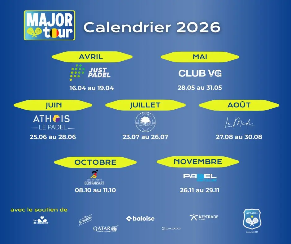 Parmi les nouveautés figure l’apparition d’un Summer Major, programmé du 23 au 26 juillet. Cette étape estivale se déroulera au Padel Club du Parc 1348, à Ottignies-Louvain-la-Neuve, et mettra à l’honneur le jeu en extérieur. Cette programmation en plein été vise à diversifier les conditions de jeu et à proposer un rendez-vous supplémentaire au cœur de la saison.