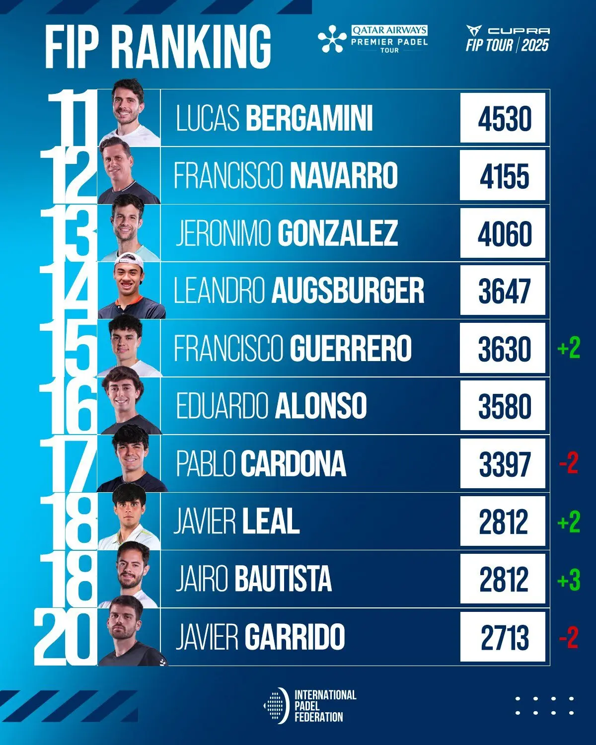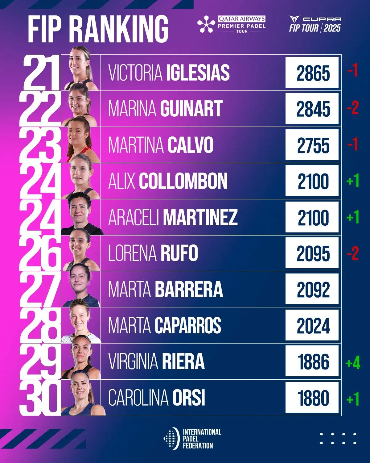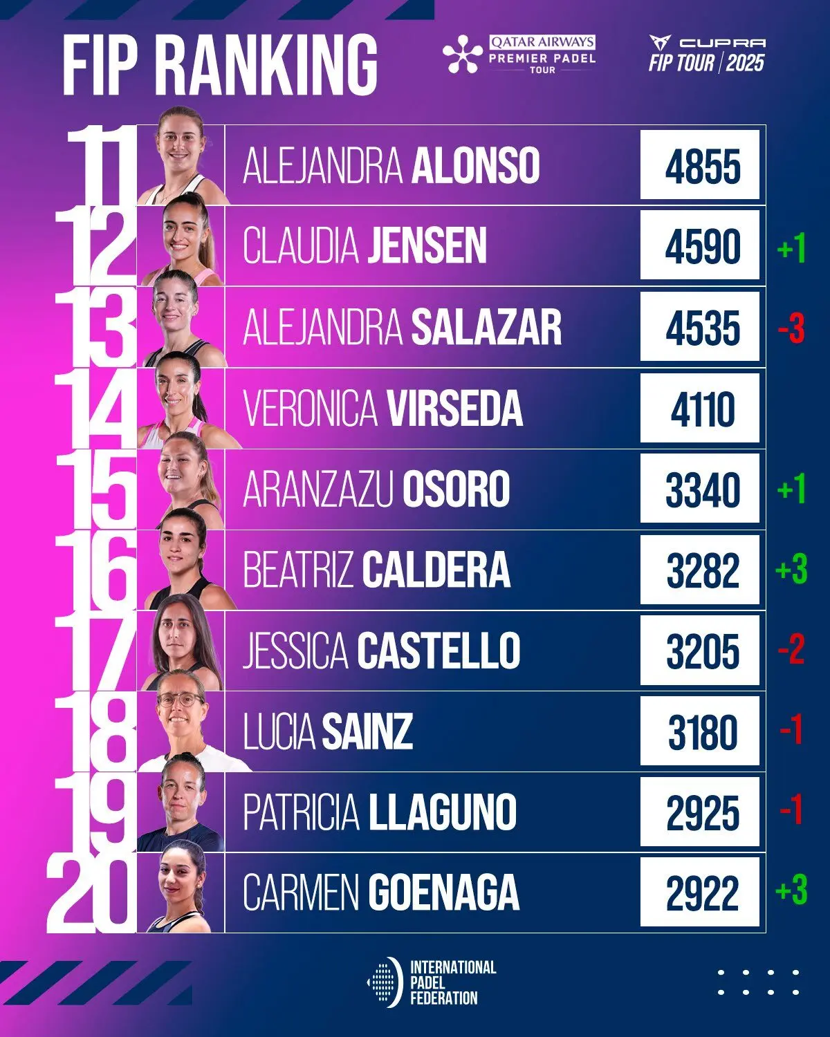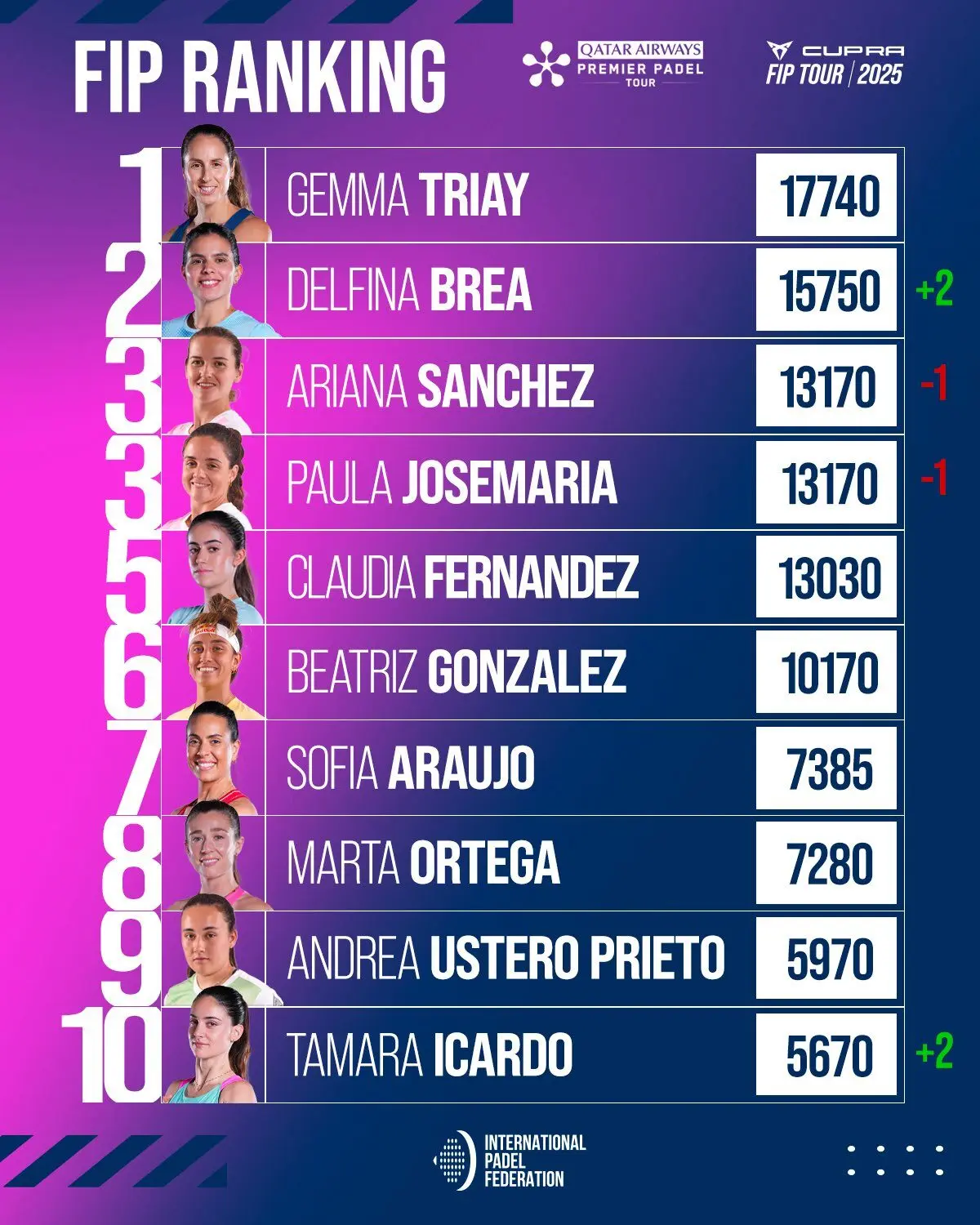 Côté féminin, c’est la grande nouvelle : Delfi Brea dépasse individuellement Ari Sánchez et Paula Josemaría pour s’installer seule à la 2e place mondiale, juste derrière sa partenaire Gemma Triay. Une consécration logique après plusieurs mois de régularité et de titres. Claudia Fernández, elle, reste en embuscade et pourrait bientôt dépasser les ex-numéro 1 mondiales.