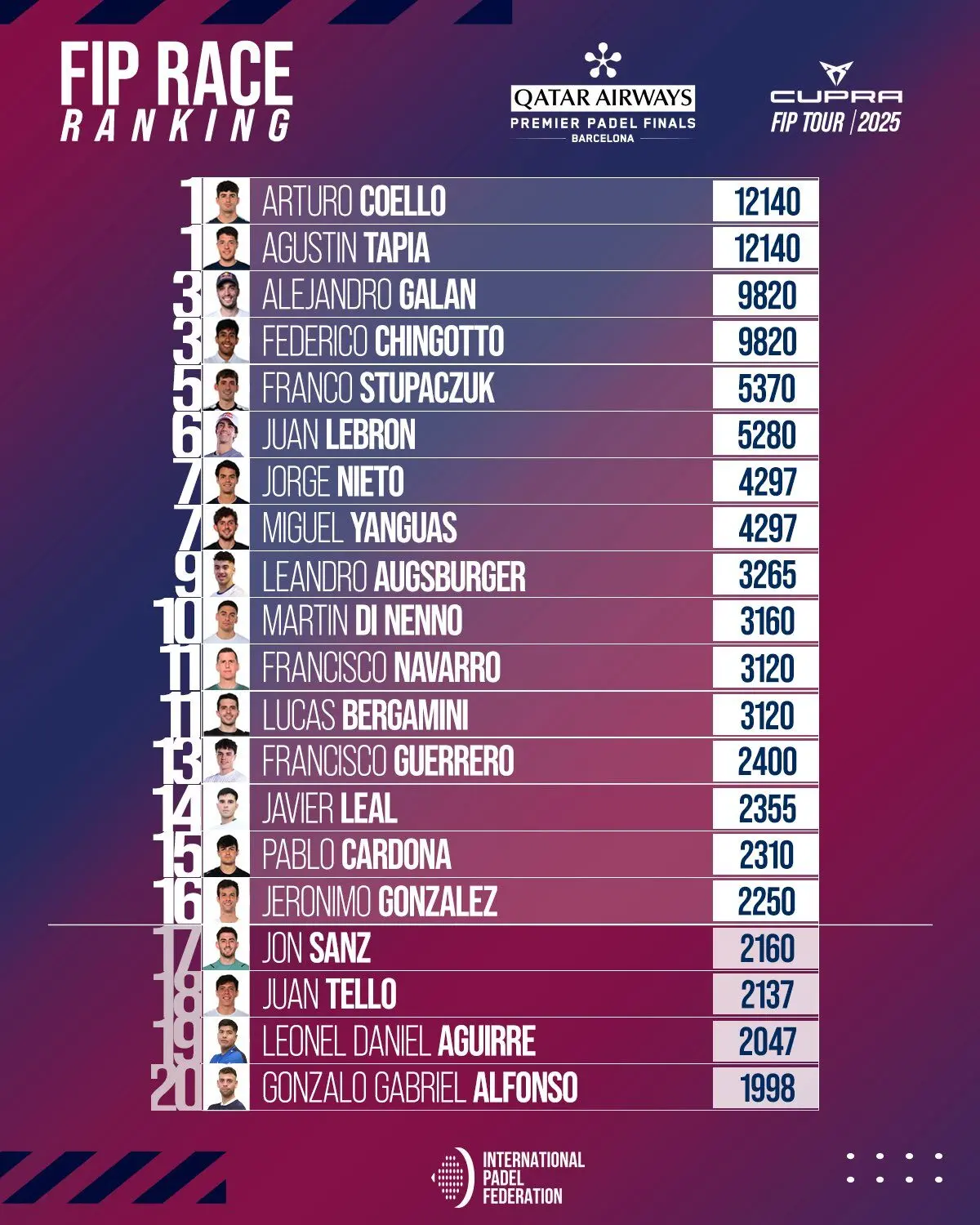Vainqueurs à Paris, Arturo Coello et Agustín Tapia consolident leur statut de numéros 1 mondiaux. Déjà largement en tête, ils augmentent encore leur avance sur Ale Galán et Fede Chingotto avec près de 6000 points d’avances.