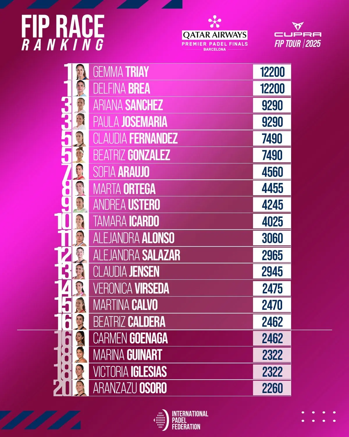 Tamara Icardo, finaliste à Paris, grimpe au 10e rang, récompensée de sa saison solide. Le binôme Bea Caldera / Carmen Goenaga continue sa percée, avec trois places gagnées chacune, les plaçant désormais dans le top 16 de la RACE, en position favorable pour les Premiers Finals de Barcelone.