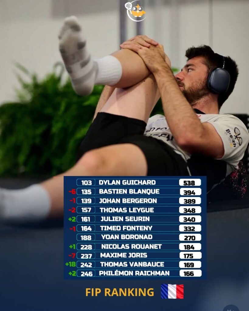 Nicolas Rouanet poursuit lui sa progression avec une place gagnée, alors que Maxime Joris, encore peu actif cette saison sur le FIP Tour, recule lourdement avec 7 places perdues.
