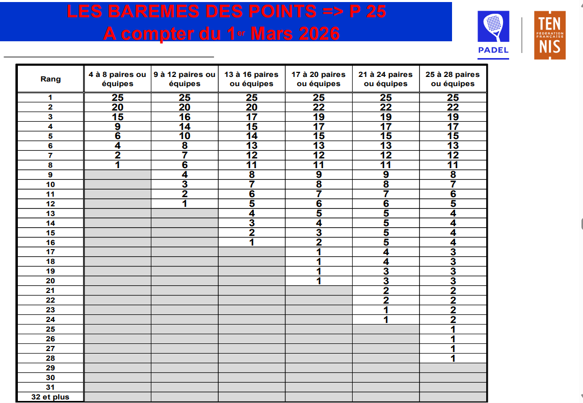 À compter du 1er mars 2026, la Fédération française de tennis applique une nouvelle grille de barèmes de points pour une partie des catégories tournois de padel homologués, du P25 au P500. Une réforme qui vise à harmoniser la valorisation des performances en fonction du niveau de l’épreuve, du nombre de paires engagées et du rang final obtenu.