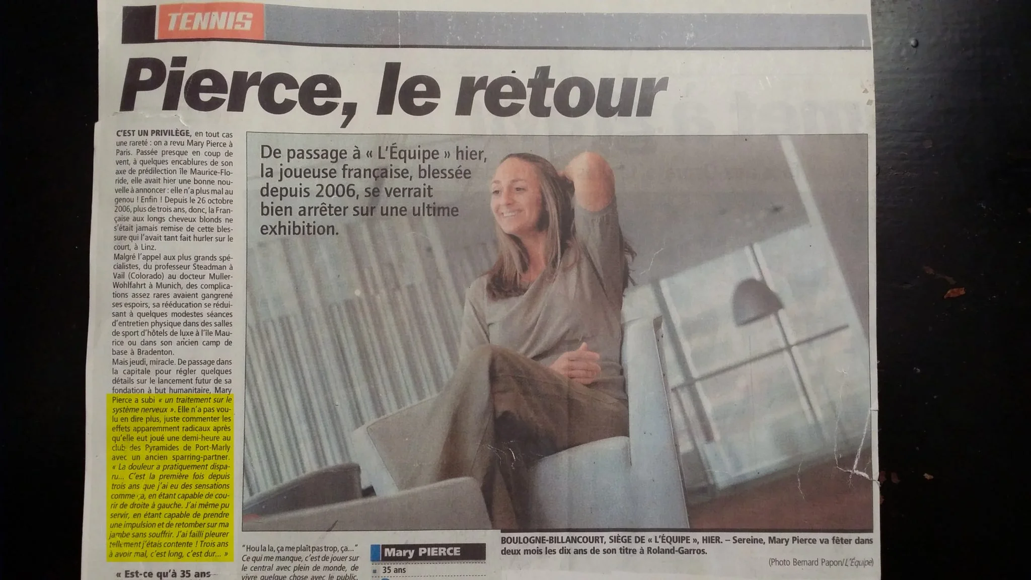 Mary Pierce a fait une séance suite à son problème de genou et m’a fait un article dans le journal l’Equipe du 10 avril 2010.
