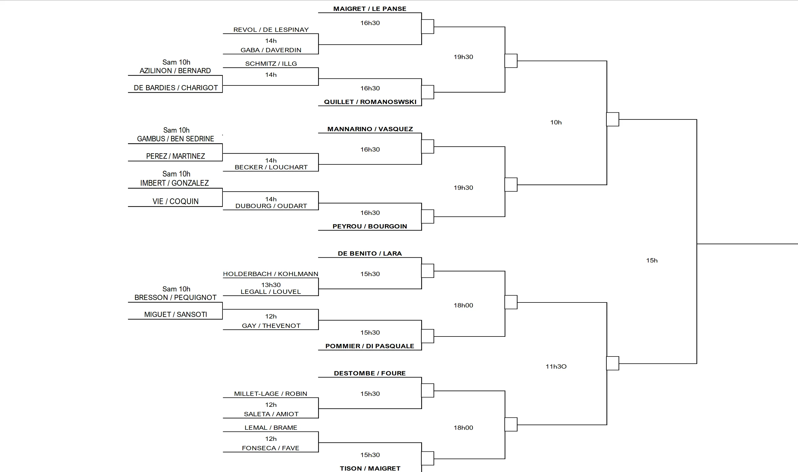 Chez les messieurs, dans le haut du tableau, on s’attend une demi-finale Maigret / Le Panse vs Mannarino / Vasquez, même si la paire Peyrou / Bourgoin peut être toujours surprenante. Dans le bas du tableau, on aura, sauf énorme surprise, la paire De Benito / Lara Salines vs Maigret / Tison. On a hâte de voir ça.