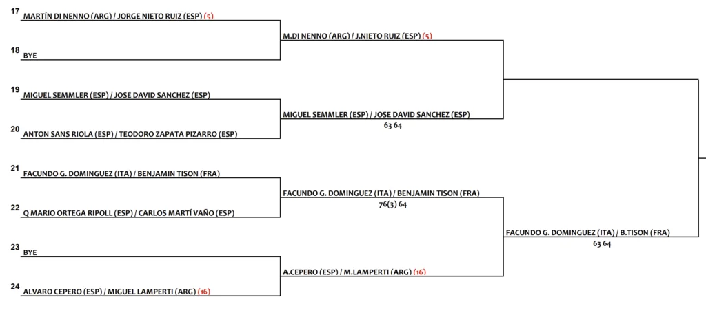 Et le Français, Benjamin Tison et son partenaire Facundo Dominguez se trouvent justement dans cette fameuse partie de tableau. Au lieu de jouer potentiellement Di Nenno / Nieto, tête de série 5, c’est face à la paire espagnole Miguel Semmler / Jose David Sanchez que le tricolore et son coéquipier joueront pour une place en quarts de finale.