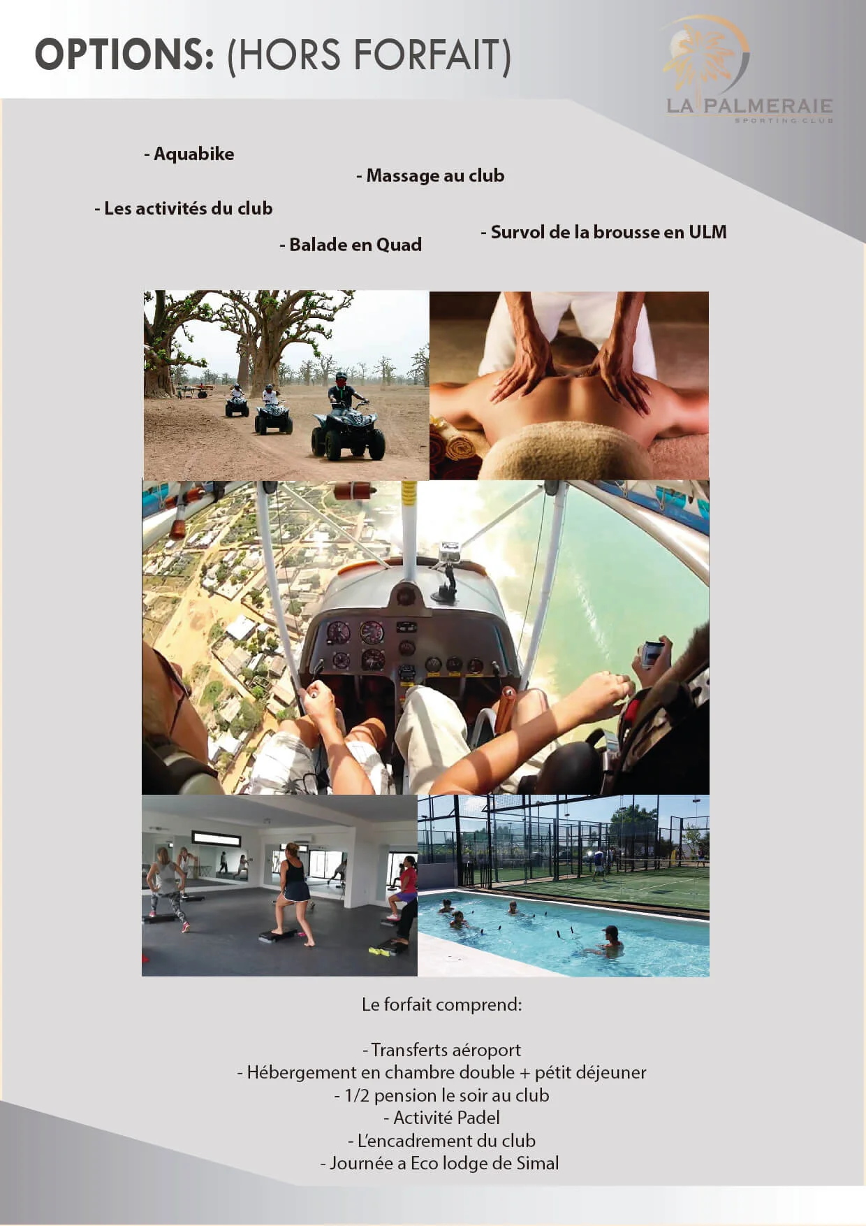 Ce circuit comprend un séjour de 1 semaine en villa privée luxe , circuit touristique à Saly et visite de la réserve animale de “bandia ” , 1 nuit a l’Ecolodge de Simal et ballade en pirogue , et le soir petit tournoi au club de la Palmeraie avec un club à 50 m des villas , la restauration est en demi-pension soit au club , soit restaurant local et une équipe d ‘encadrement sur place.