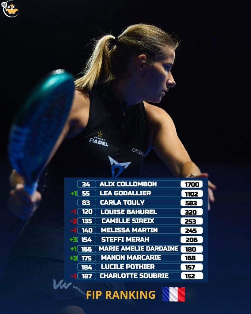 En tête, Alix Collombon reste solidement installée au 34e rang mondial avec 1700 points. Derrière elle, Léa Godallier gagne une place et remonte au 55e rang mondial avec 1102 points.