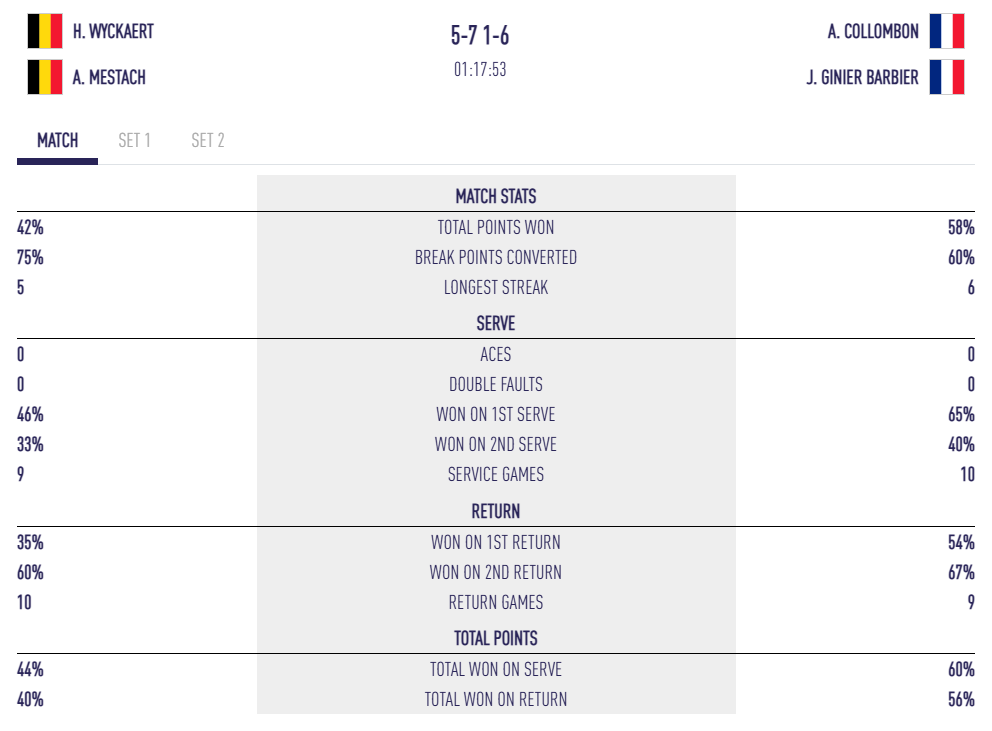 Derrière, Alix Collombon et Jessica Ginier Barbier ont d’abord été bousculées dans le premier set par la paire Helena Wyckaert / An-Sophie Mestach. Menées 4-2 avec un break, elles ont su hausser leur niveau pour renverser la situation et remporter la manche 7/5, avant de dérouler dans la seconde (6/1) grâce à leur expérience.