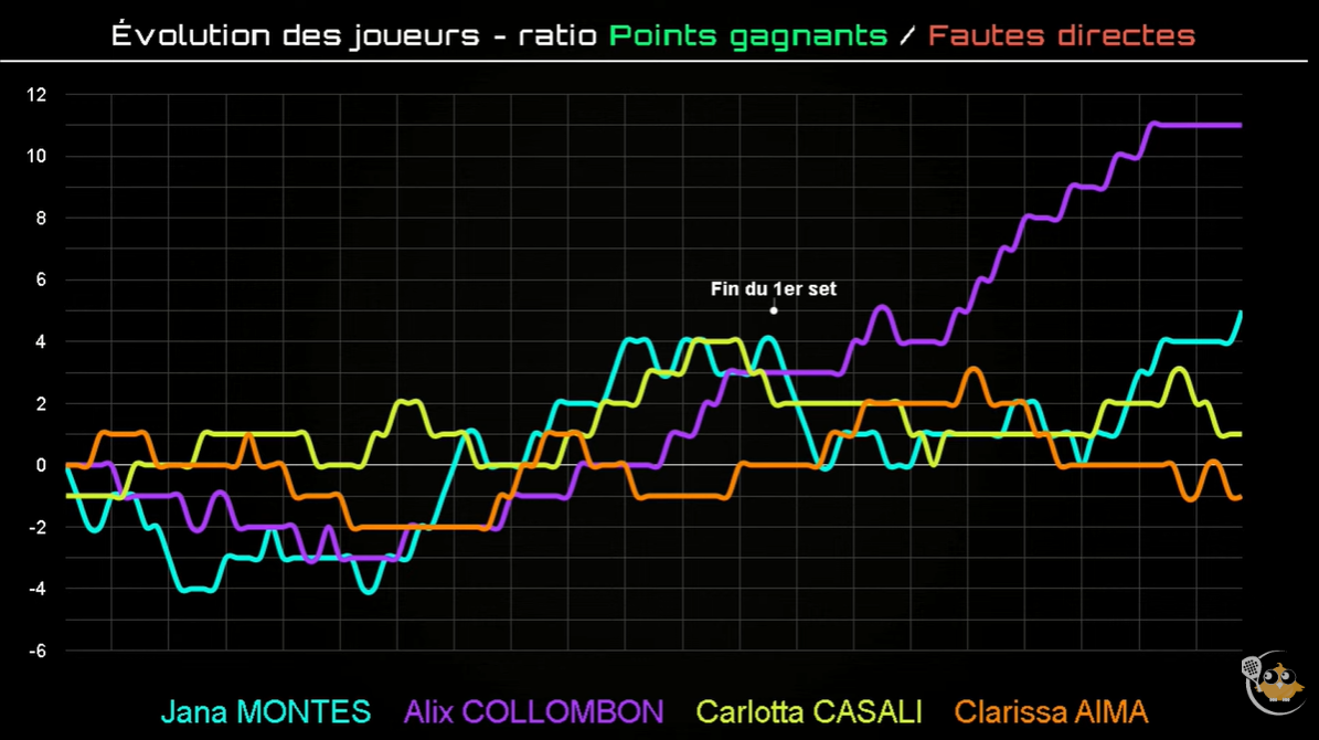 Sans paniquer, les favorites ajustent progressivement leur jeu. En réduisant les fautes directes et en imposant davantage de rythme, la dynamique bascule. Jana Montes monte clairement en puissance, notamment en attaque, pendant qu’Alix Collombon stabilise la diagonale et fait reculer ses adversaires.