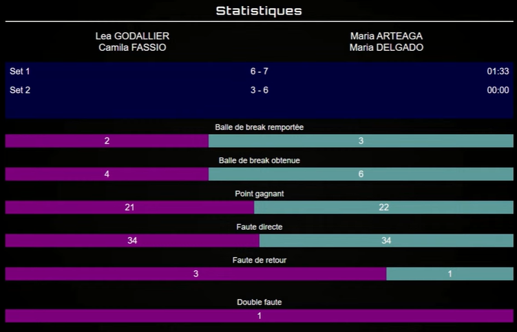 La différence s’est faite dans les moments clés. Le tie-break du premier set, décisif, a clairement basculé en faveur d’Arteaga et Delgado, plus solides et plus lucides sous pression. Dans le second set, les Espagnoles ont su convertir leurs rares opportunités, là où Godallier et Fassio n’ont pas réussi à inverser la tendance.