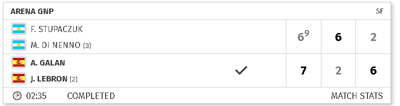 Mais dans le set décisif, Lebrón et Galán prennent les commandes et imposent un rythme que Stupaczuk et Di Nenno n’ont pas réussi à contrer. 6/2