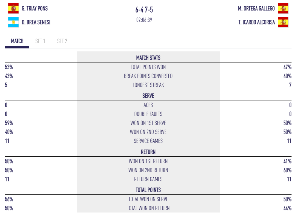 Les statistiques illustrent bien cette supériorité offensive : 65 coups gagnants contre seulement 28 pour Ortega / Icardo. Gemma et Delfi commettent 39 fautes directes (contre 21), mais leur agressivité paie, notamment grâce à une Triay impériale. Ortega et Icardo se procurent 10 balles de break, mais les numéro 1 ont su serrer le jeu dans les moments clés.