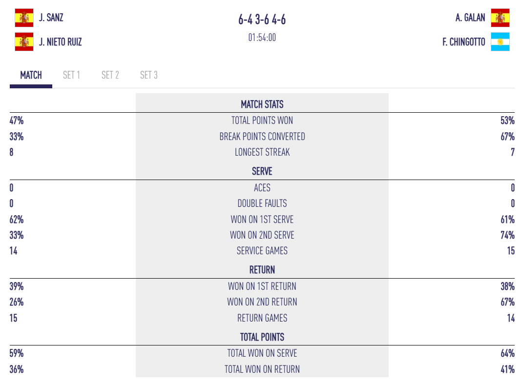 - Fautes directes : 39 pour Galán / Chingotto contre 49 pour Sanz / Nieto