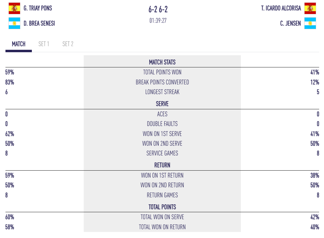 Delfi Brea se montre particulièrement dangereuse avec son revers, mettant régulièrement la pression sur la paire adverse. Malgré une très bonne résistance d’Icardo et Jensen, cette dernière semblant légèrement gênée sous le pied sans que cela n’affecte réellement son niveau, Triay et Brea finissent par faire la différence pour s’adjuger la manche 6/2.