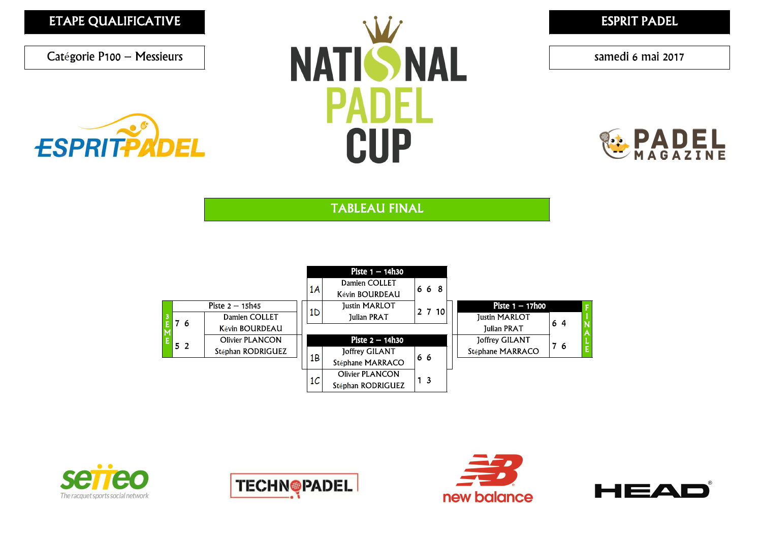 Les vainqueurs messieurs Joffrey GILANT et Stéphane MARRACO en sont un parfait exemple. Avec un Stéphane à la régularité de métronome et un Joffrey bombardier en chef, ils s’imposent sans concéder un set en décapitant successivement les têtes de série 2 (Quentin Faucheur/David Charleux) en poule ; 3 (Olivier Plancon/Stéphan Rodriguez) en demi et 4 (Justin Marlot/Julian Prat) en finale.