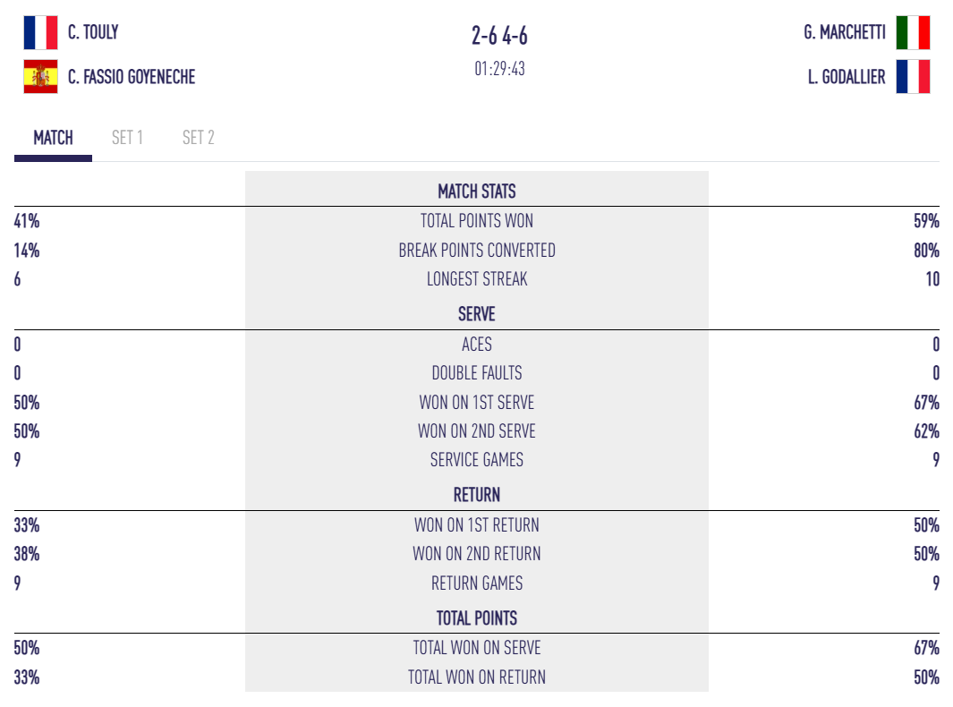 Si le premier set a été nettement dominé (6/2), le second a été plus accroché. À 4/4, Godallier et Marchetti ont su faire le break au meilleur moment avant de conclure solidement sur leur mise en jeu.