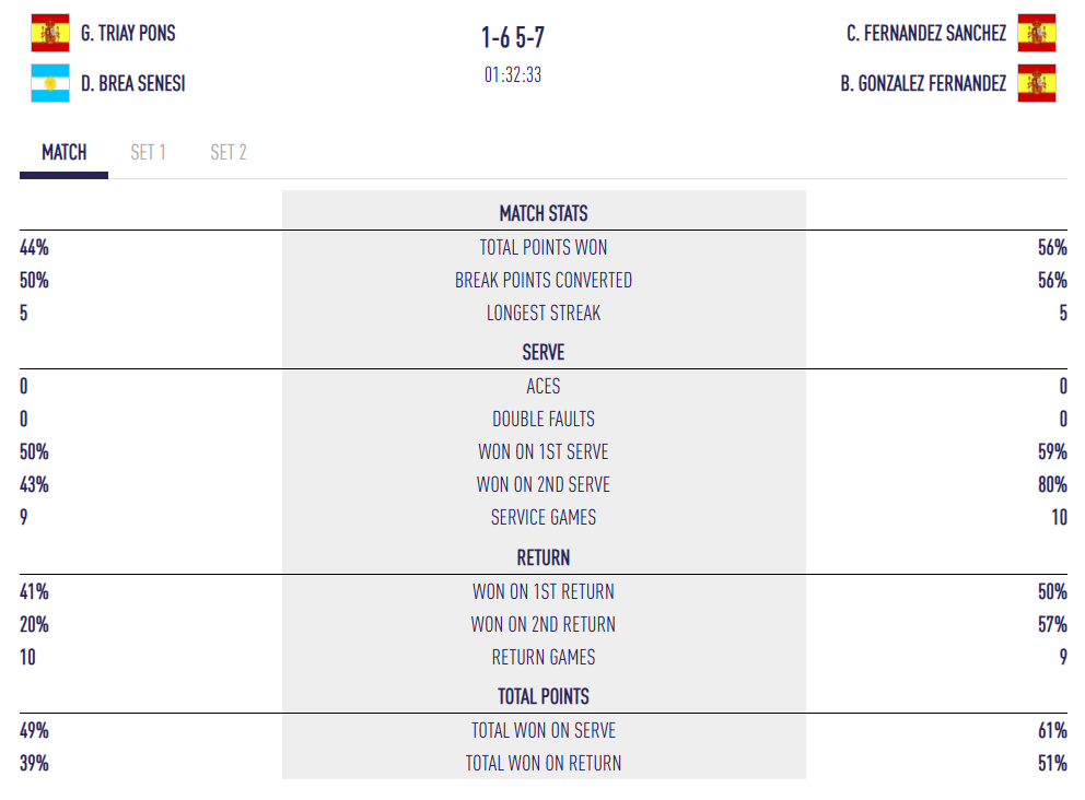 À 5/5, González / Fernández reprennent immédiatement le service de Brea : l’Argentine craque, enchaîne les fautes directes, et offre le break décisif.