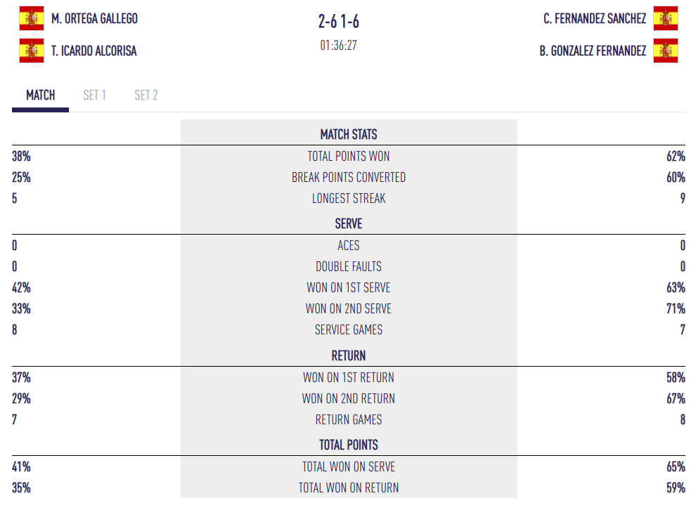 Le score sec de 6/2 pourrait laisser croire à une formalité, mais ce premier set a duré 58 minutes. L’intensité était maximale dès les premiers échanges, dans un central chauffé à bloc. Dans cette bataille, González et Fernández ont su faire la différence dans les moments clés : 3 balles de break converties sur 6 contre seulement 1 sur 4 pour leurs adversaires.