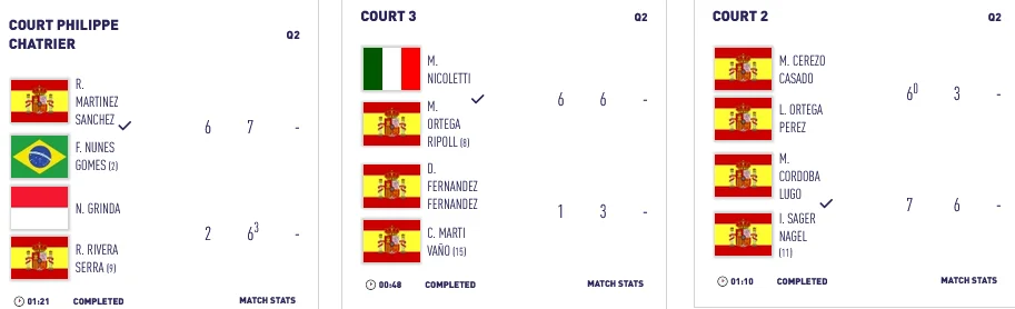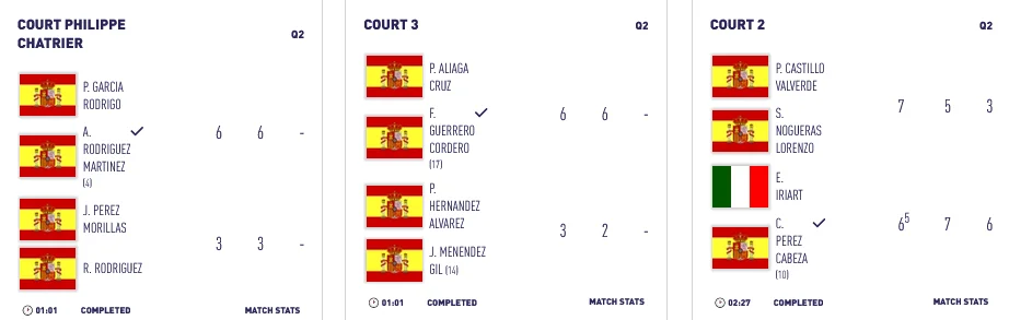 Sous le soleil parisien, huit paires ont validé leur ticket pour le tableau final du “Roland-Garros padel” cet après-midi. Parmi les matchs les plus chauds, on retiendra celui remporté par Cabeza/Iriart sur le score de 6/7 7/5 6/3 face à Castillo/Nogueras, et celui entre Pozo/Señoran et Garcia/Mouriño qui vient de se finir par la victoire de ces derniers (6/7 6/4 6/4).