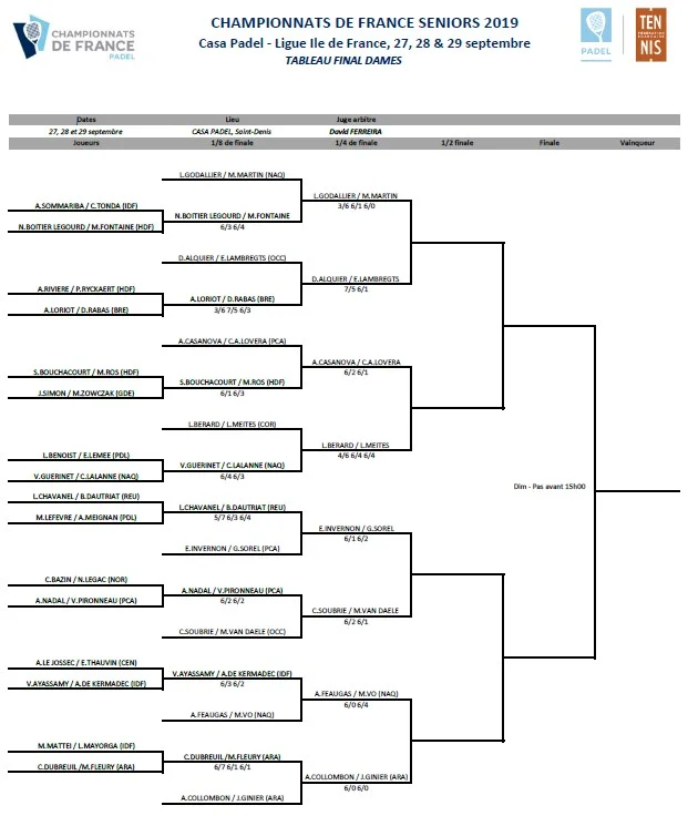 Tableaux et horaires de la seconde journée des Championnats de France de padel 2019 à Casa Padel.