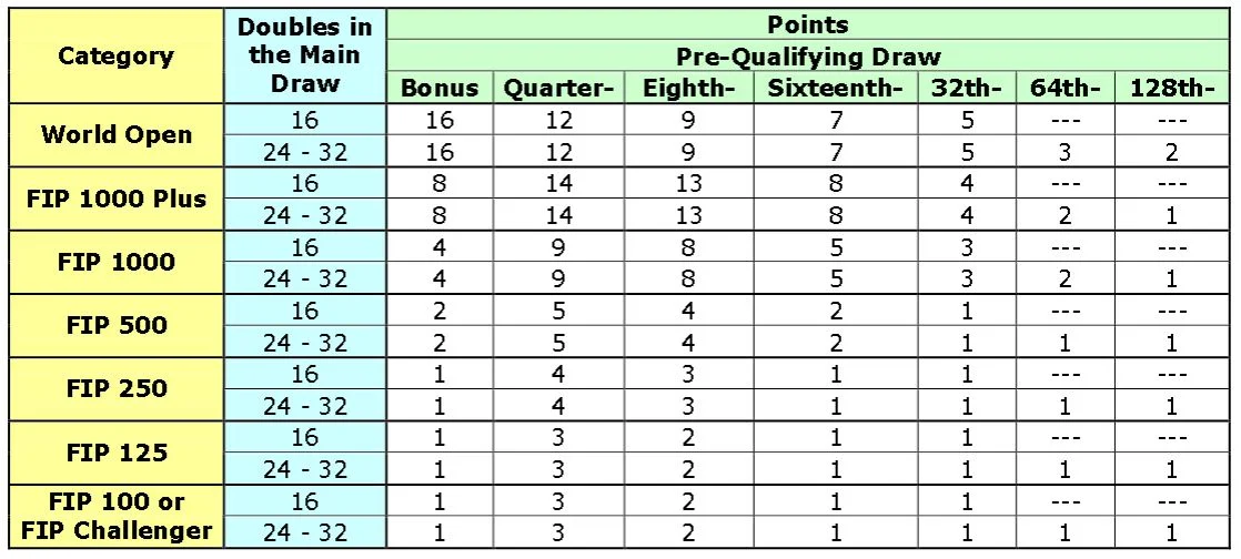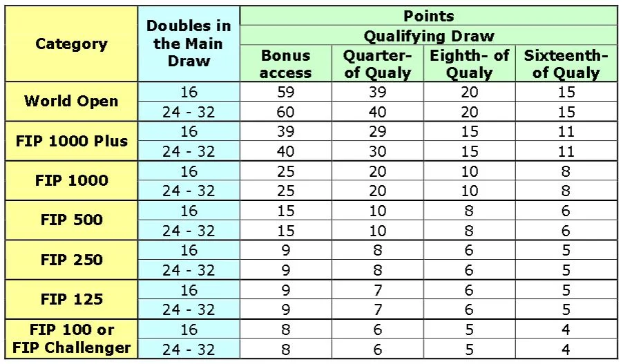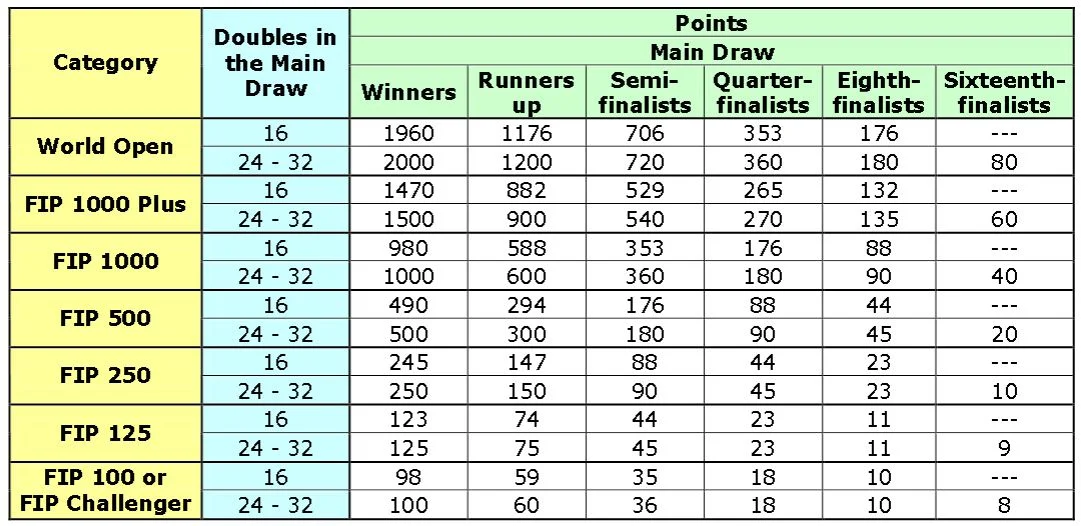 Women’s, minimum US$ 650. - Category FIP 100 or FIP Challenger Tournament:
