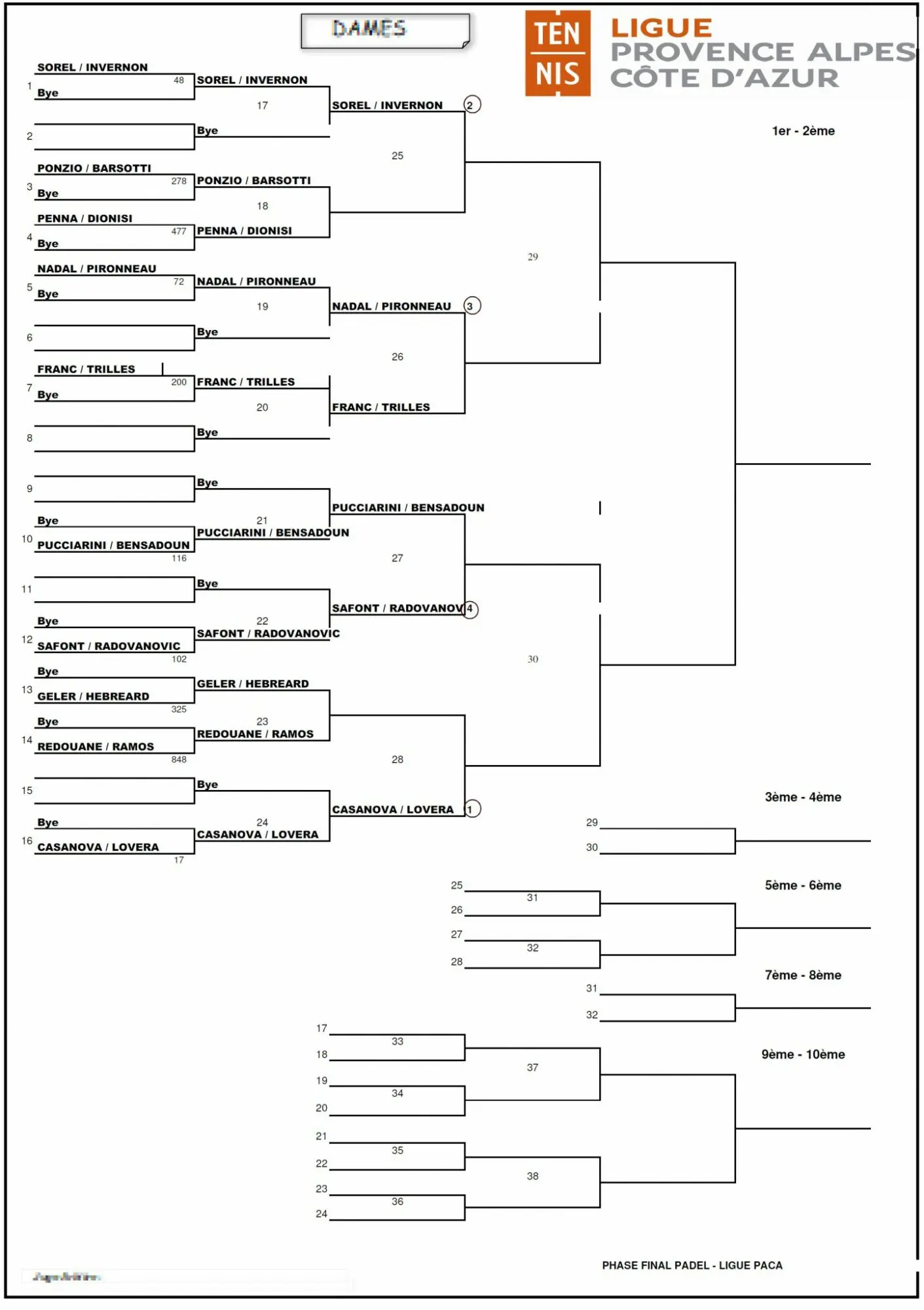 Chez les dames, si les deux premières têtes de séries, Elodie Invernon / Géraldine Sorel et Lovera / Casanova devraient se retrouver en finale, on peut constater l’énorme plateau général digne d’un plateau messieurs. Du niveau et une belle concurrence.