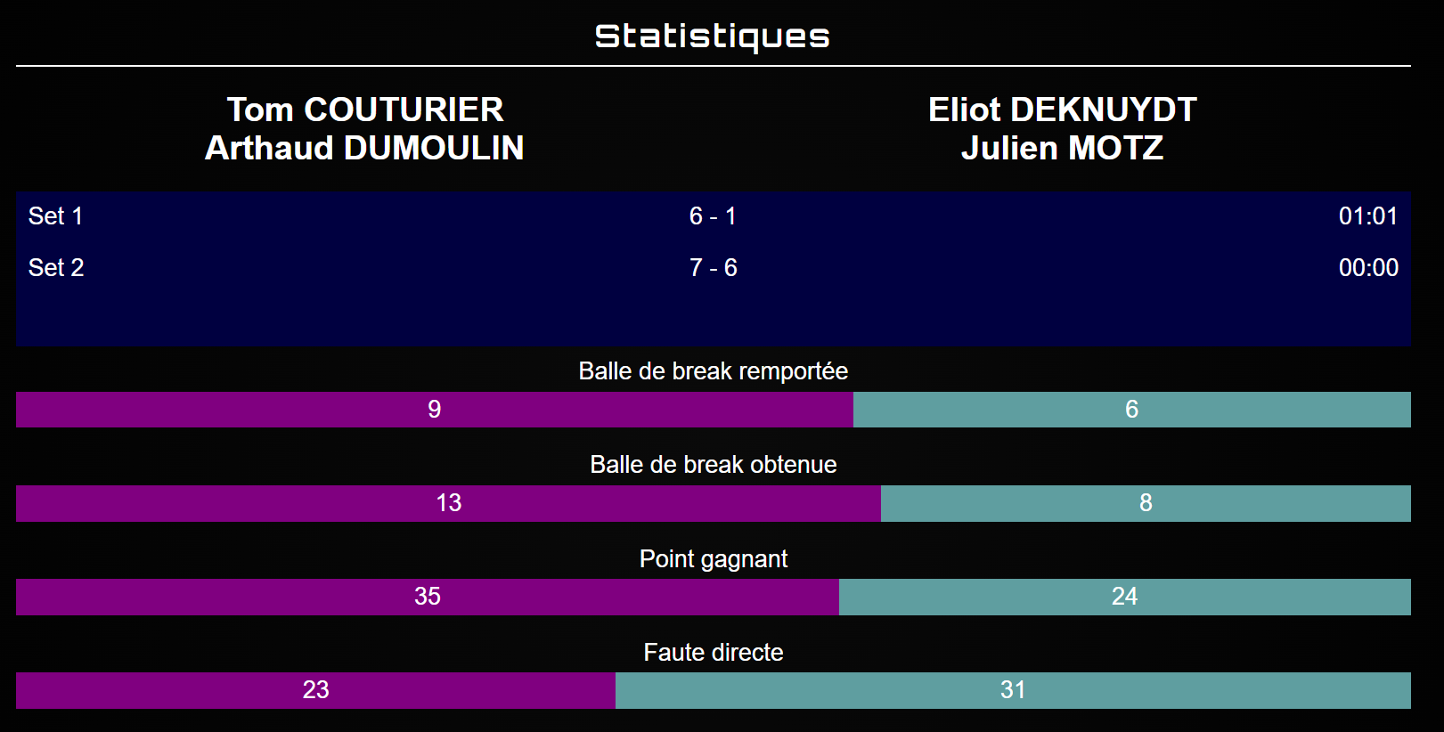 Victoire 6/1 7/6 en 1h01, avec des statistiques qui confirment la supériorité de Couturier / Dumoulin (plus de points gagnants, meilleure efficacité sur balles de break).