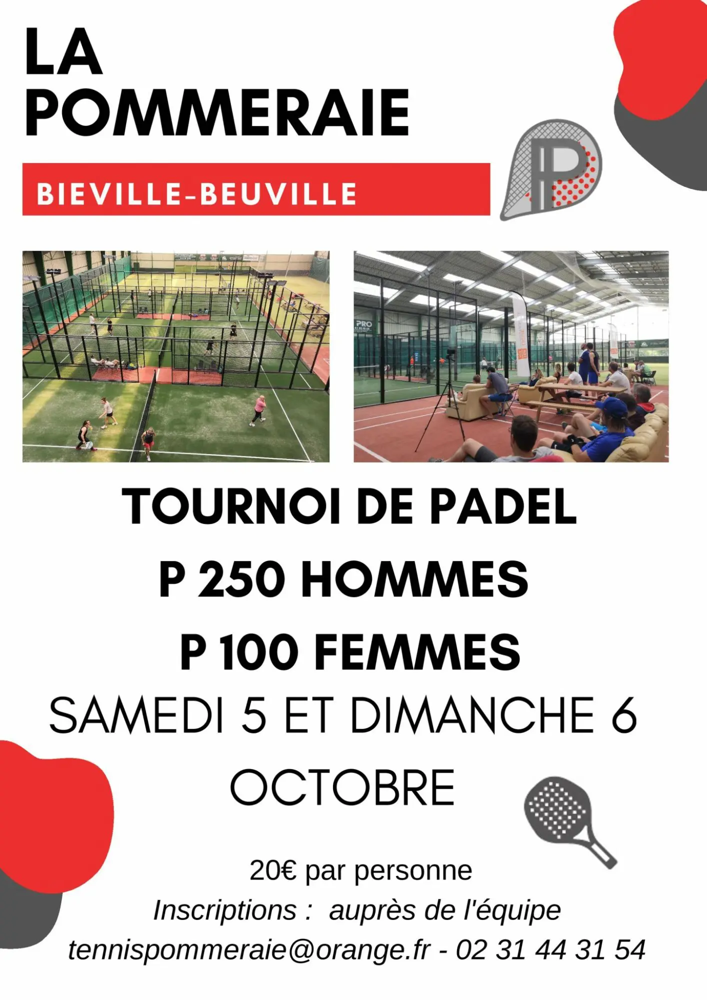 Le Tc la Pommeraie de Bieville-Beuville vous attend ce week-end, samedi et dimanche, pour participer à ses tournois de padel. En effet, 2 tournois proposés : un P250 hommes et un P100 femmes. Pour tous ceux qui souhaiteraient participer, n´hésitez pas à contacter l´équipe du Tc la Pommeraie au 02 31 44 31 54 ou par mail tennispommeraie@orange.fr